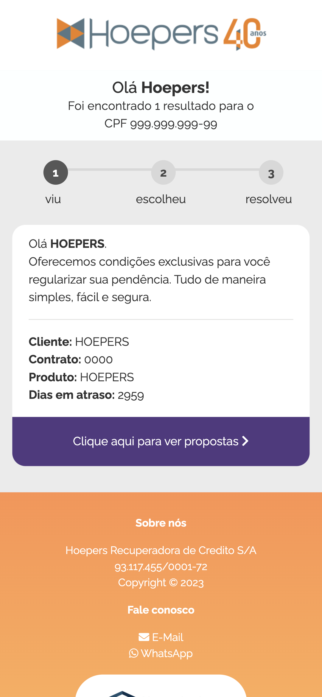 Com 42 anos de experiência, a Hoepers tem orgulho do seu compromisso de transformar vidas, ajudando pessoas a renegociar dívidas e recuperar o controle financeiro. Testemunhamos muitas histórias de sucesso, reforçando nosso compromisso com uma vida financeira saudável.